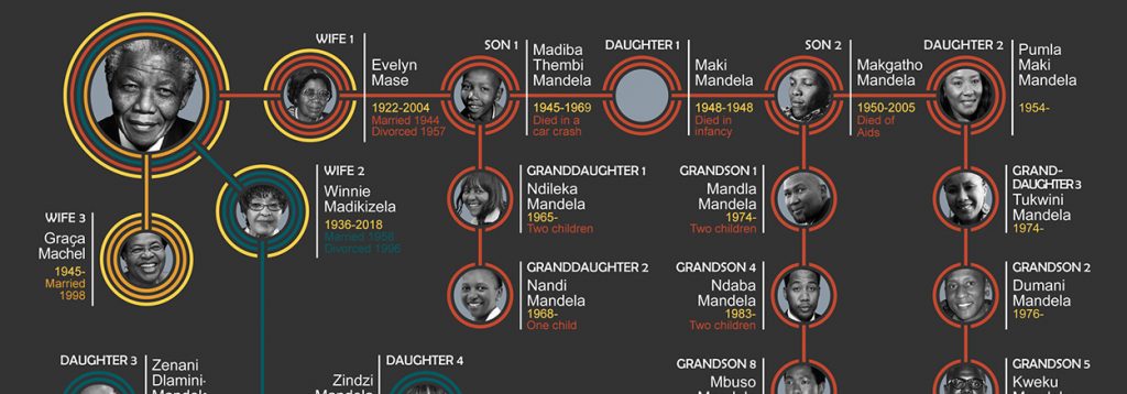 Nelson Mandela was born in 1918 and died, aged 95, in 2013. His family tree has grown from three wives and six children to 17 grandchildren, 19 great-grandchildren, and on …