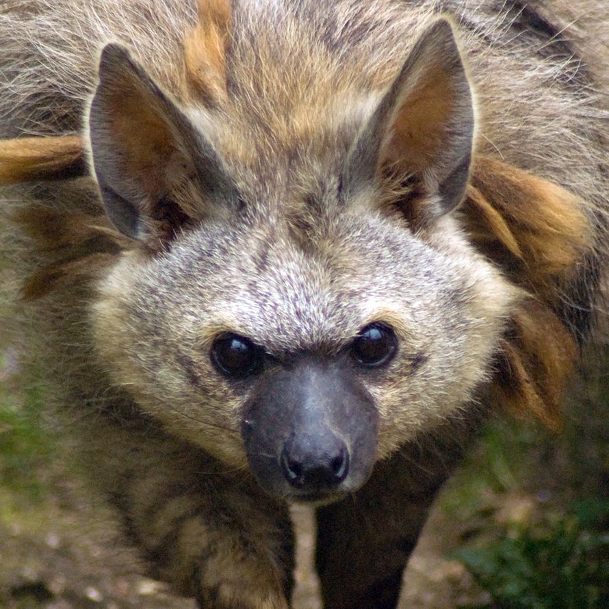 aardwolf (noun) – African burrowing mammal Proteles cristatus, a member of the hyena family, which feeds mainly on termites. From the Afrikaans aard (earth) and wolf (wolf)