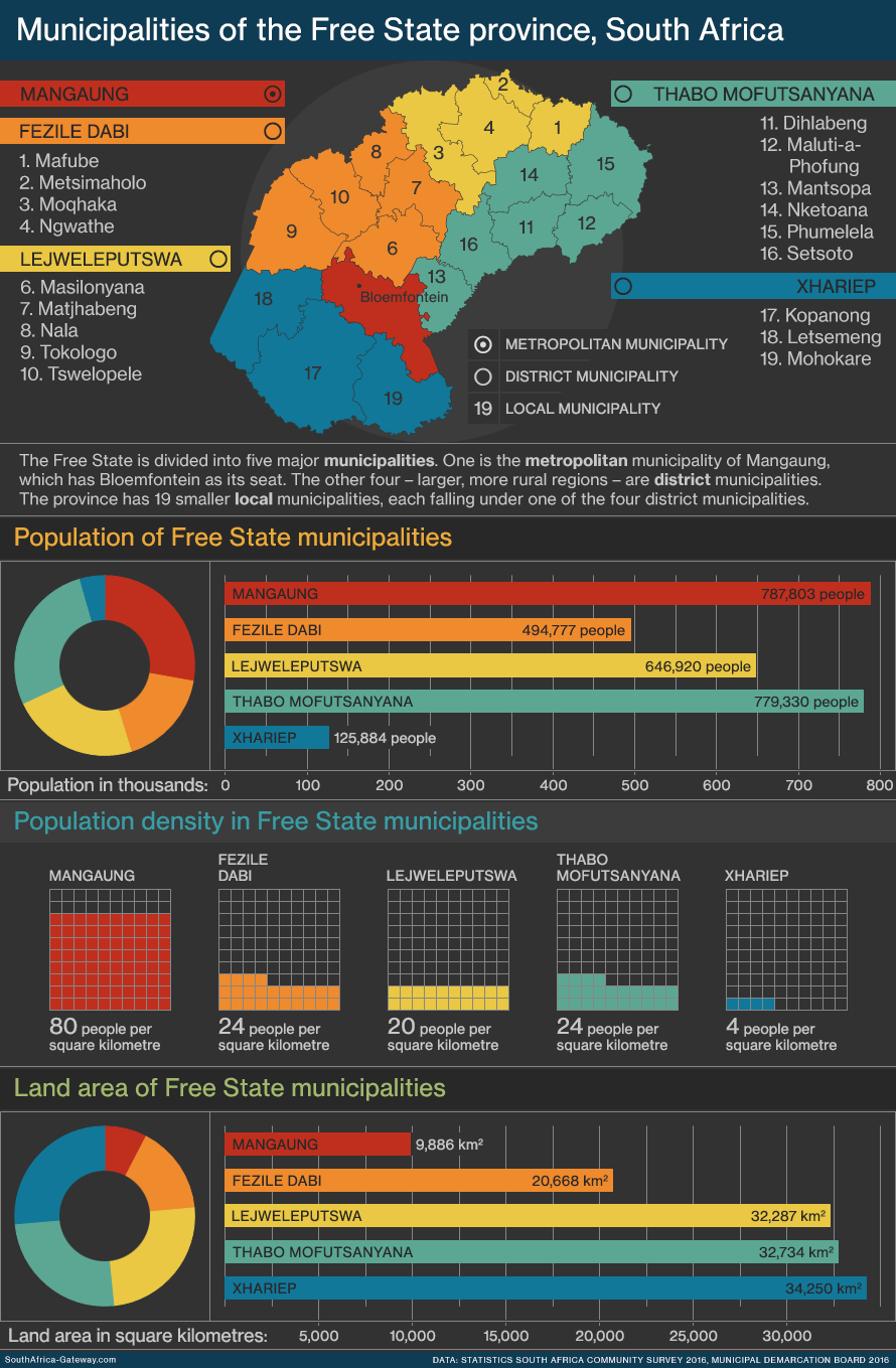 Local government in the Free State is organised into five major municipalities. One is metropolitan, and the other four district municipalities. The districts are further divided into 19 local municipalities.