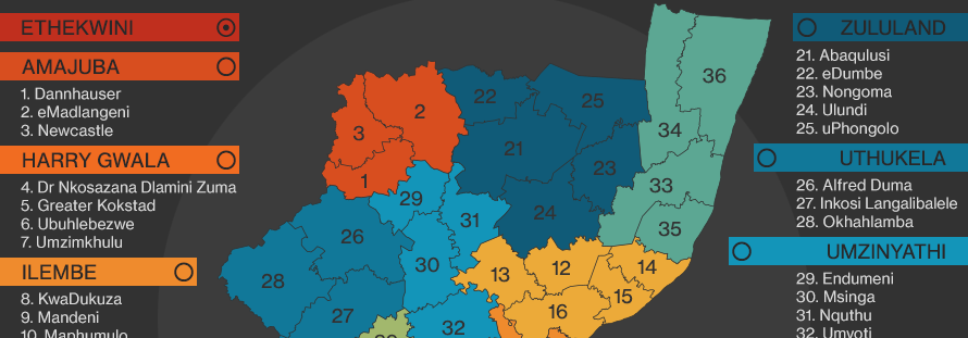 Local government in KwaZulu-Natal is organised into eight major municipalities. One is metropolitan, and the other 10 are district municipalities. The districts are further divided into 43 local municipalities.
