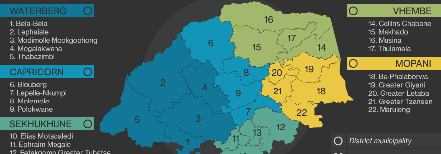 Local government in Limpopo is organised into five district municipalities. The province also has 22 smaller local municipalities, each falling under one of the five district municipalities.