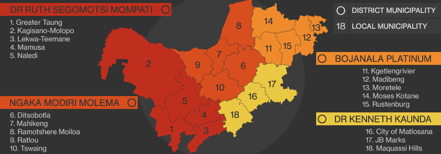 | Ngaka Modiri Molema | District | Mahikeng | 28,114 | 889,108 | 32 |