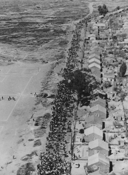 A photographer in a police helicopter captured this view of the students’ march, before the shooting started. (Doing Violence to Memory: The Soweto Uprising)