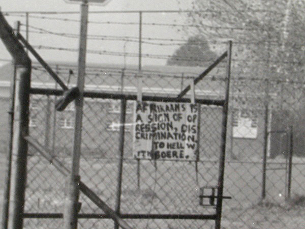 A 1976 student’s poster on a fenced-in Soweto school reads: “Afrikaans is a sign of oppression, discrimination. To hell with Boere.” (Doing Violence to Memory: The Soweto Uprising)