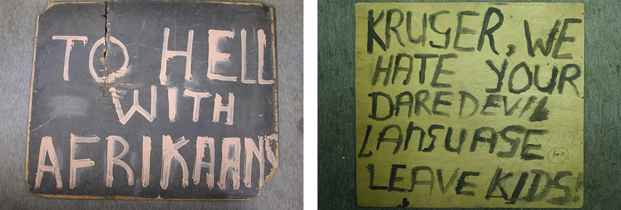 Two of the many placards produced by students during the uprising (later confiscated and photographed by the police) highlight their antagonism to Afrikaans. The placards were written in English, the students’ second language. (Doing Violence to Memory: The Soweto Uprising)