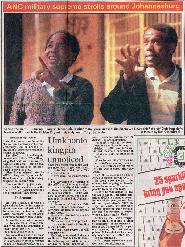 On 20 June 1990 Tokyo Sexwale (right) showed Chris Hani, recently returned from exile, around Johannesburg. Hani was murdered less than three years later.