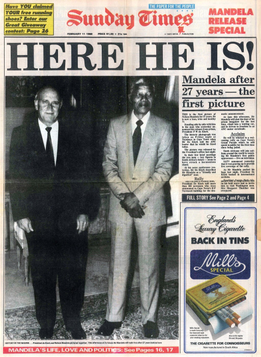 The front page of the Sunday Times on 11 February 1990, the day of Nelson Mandela's release. FW de Klerk is to his right. It was illegal for any photos of political prisoners to be published, so this was the first picture of Mandela the world had seen since 1962. (Sunday Times)