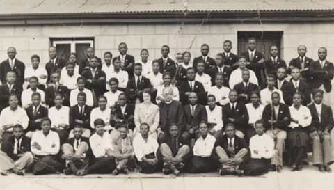 Nelson Mandela with his class at Healdtown College circa 1937 to 1938. Mandela is in the back row, fifth from right. (South African History Online)