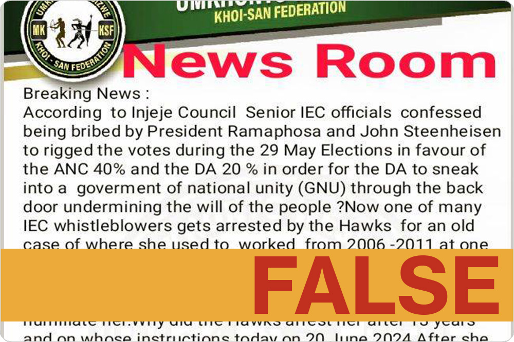 The viral claim has it that “senior IEC officials” confessed that they had been bribed by Ramaphosa and DA leader John Steenhuisen to rig the elections “in favour of the ANC 40% and the DA 20%” so that the DA could “sneak into” a government of national unity.