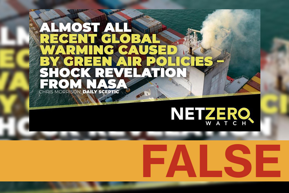 “Almost All Recent Global Warming Caused by Green Air Policies – Shock Revelation From NASA,” reads a common claim circulating on Facebook.*