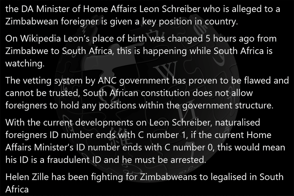Schreiber’s place of birth was recently changed on his Wikipedia page. But that’s no proof he’s “a Zimbabwean foreigner”. Instead, it points to disinformation.
