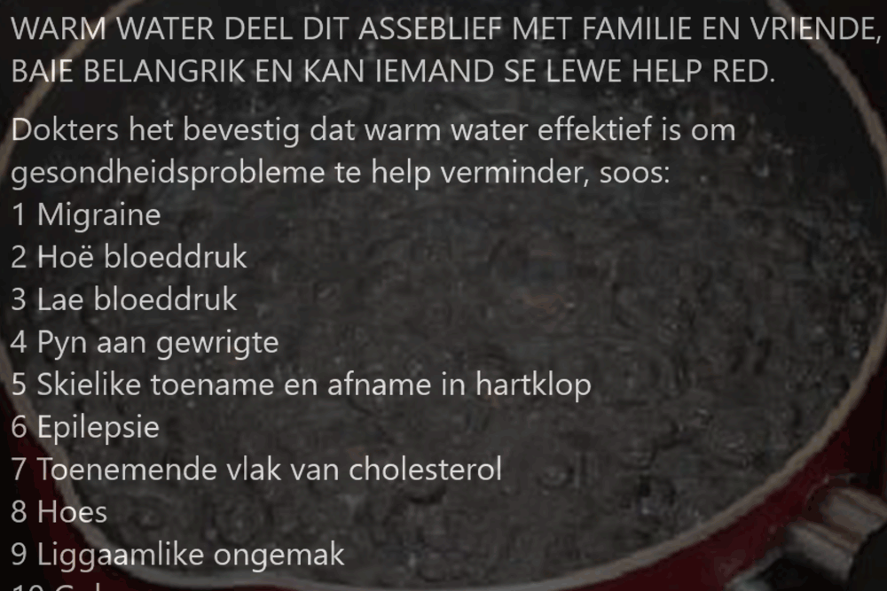 “Dokters het bevestig dat warm water effektief is om gesondheidsprobleme te help verminder,” it reads. This translates as: “Doctors have confirmed that hot water is effective in helping reduce health problems.”