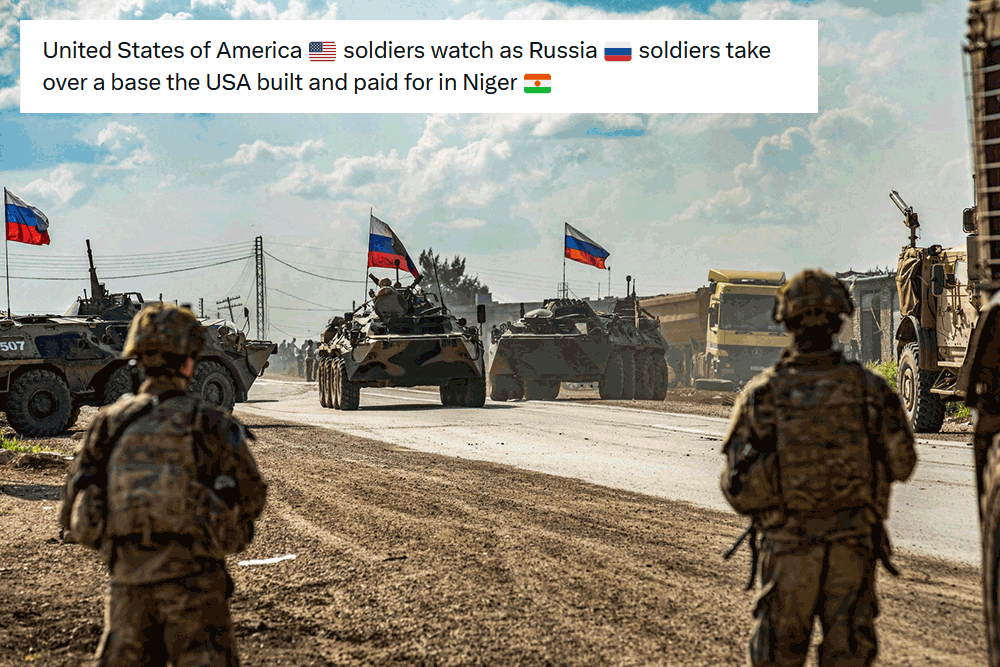 “AMERICAN soldiers watch as RUSSIAN soldiers TAKE OVER a base the US built and paid for in NIGER,” reads the caption for a photo circulating on social media since May 2024.*